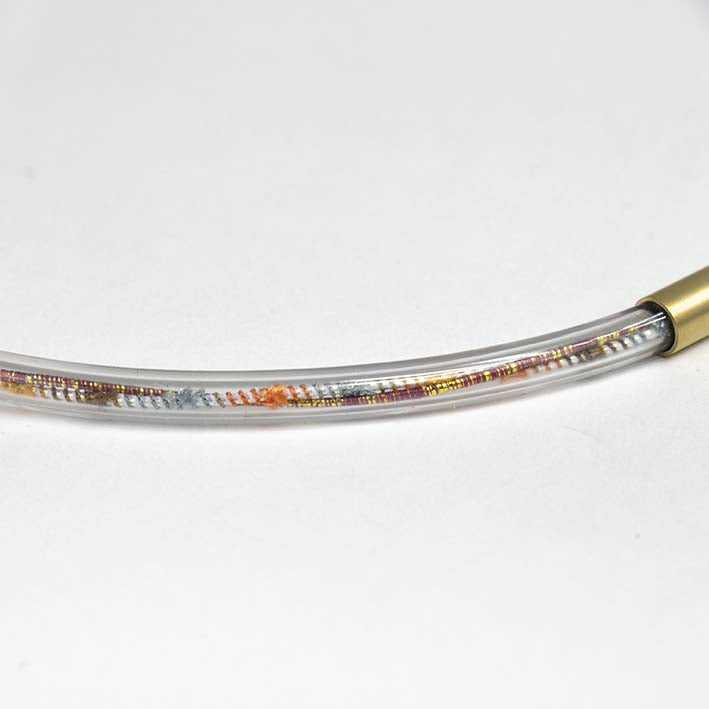 De traditionele, kleurrijke, Japanse Mizuhiki draden hebben we verwerkt in transparant rubber.