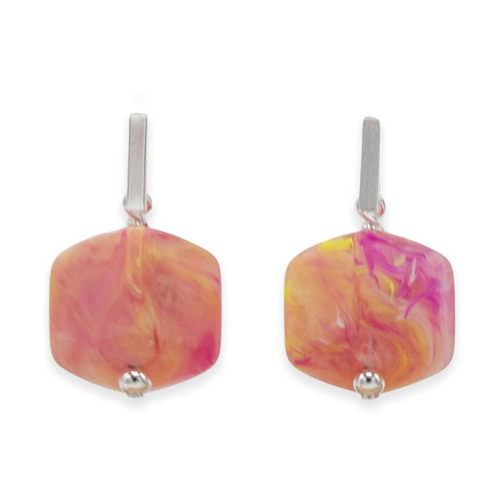 Cube Happy is uitgesproken en licht van toon. Een warme mix van roze, perzik en geel, met een levendige marmering die per oorbel verschilt. Een uitgesproken Cube binnen de collectie, optimistisch, warm en met een duidelijke eigen toon.