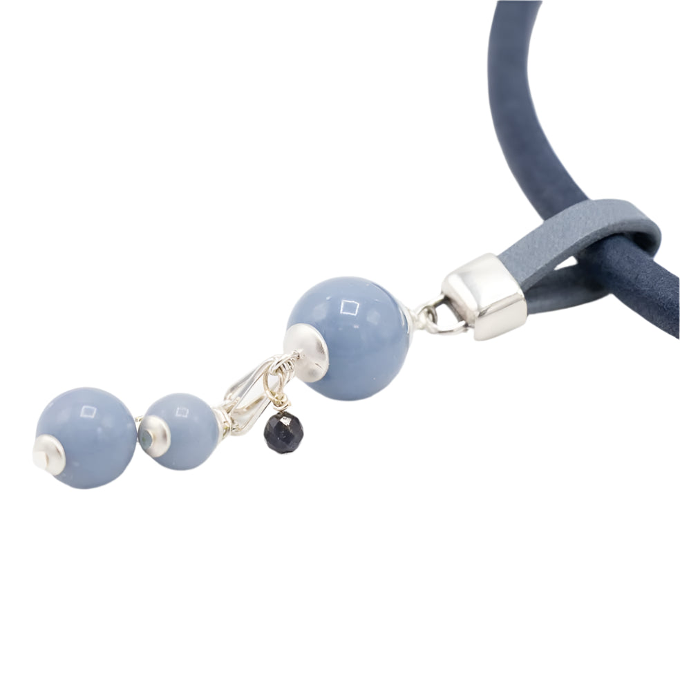 Hanger: echt leer met Angeliet (engelensteen) en een kleine facet geslepen saffier