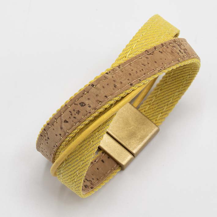 Echt een zomerhit deze vrolijke armband van jeans en kurk. Draagt heerlijk en weegt echt niets. Staat fantastisch bij een luchtige zomer outfit.
