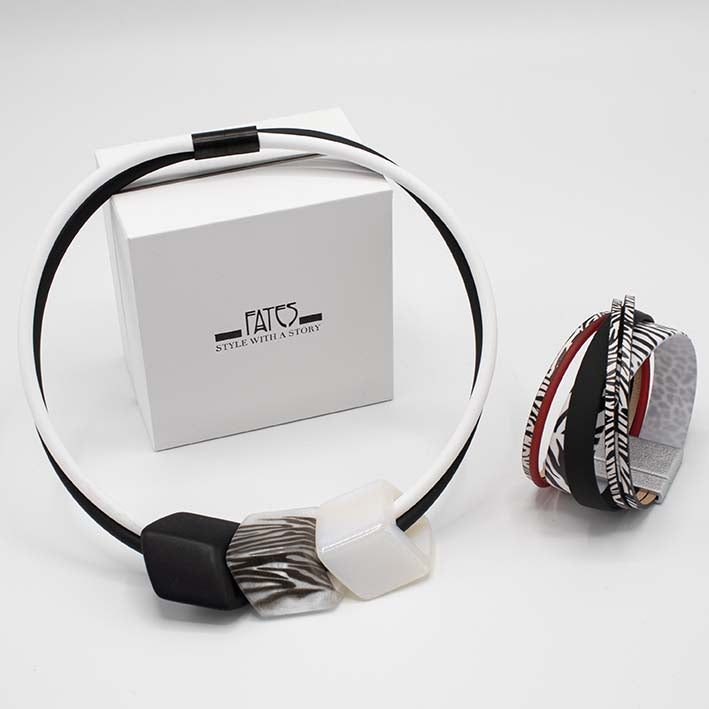 Het krachtige zwart met wit met een klein lijntje rood als accent is een echte eye catcher. De lijnen van deze armband hebben we gekruist waardoor de armband zowel speels als opvallend is.