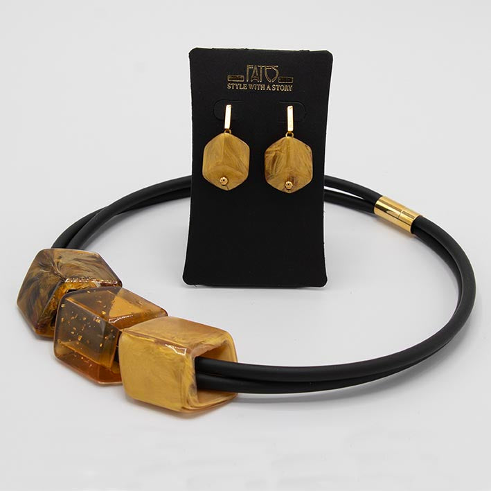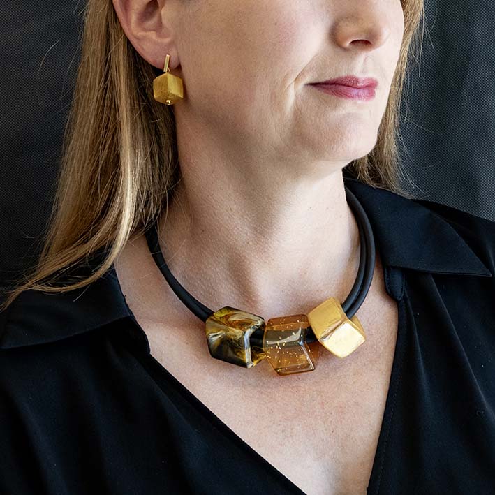 Handgemaakte sieraden van rubber en resin met verwisselbare Cubes.