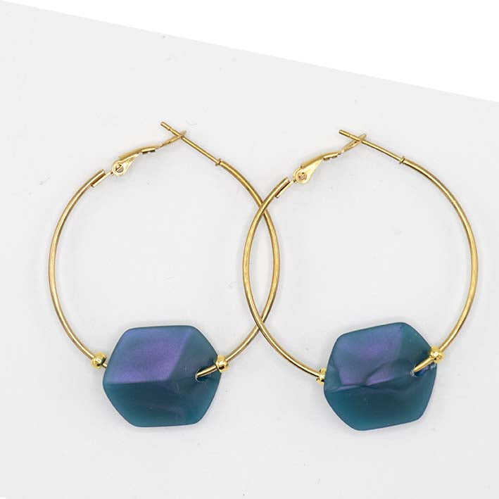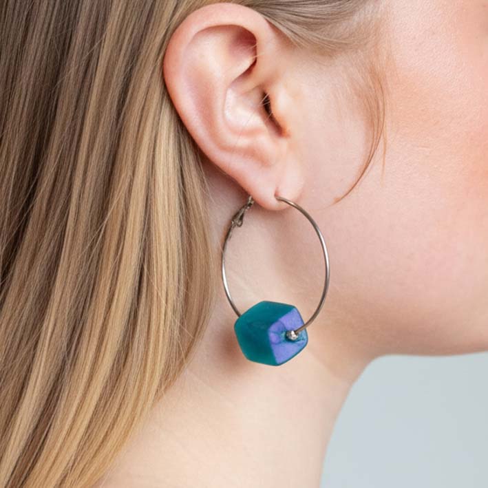 Hoop oorbellen met 1 verwisselbare mini Cube, Petrol Glow