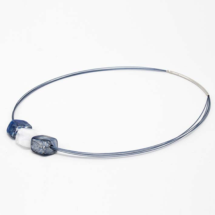 Deze ketting bestaat uit vijf fijne draden van blauw staal, gecombineerd met Mini Cubes in een mooie blauw/wit mix. Een helder, grafisch ontwerp met een contrasterend kleurenspel.