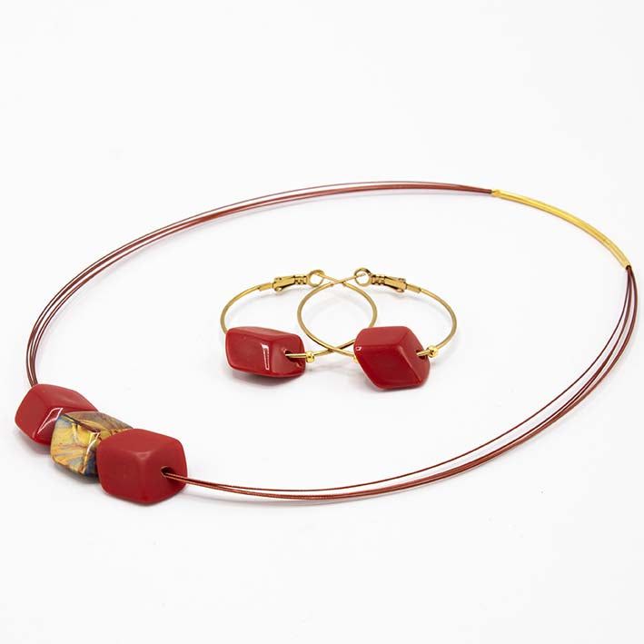 Deze ketting bestaat uit vijf fijne draden van rood staal, gecombineerd met Mini Cubes in een mooie rood mix. Een helder, grafisch ontwerp met een sterk kleurenspel.