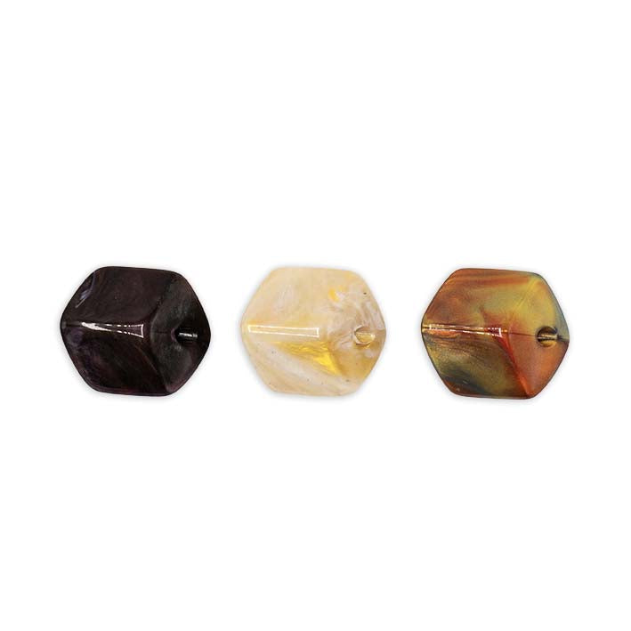 Set van 3 Mini Cubes in brons, goud en ivoor resin – kleine modulaire hangers van kunst­hars.