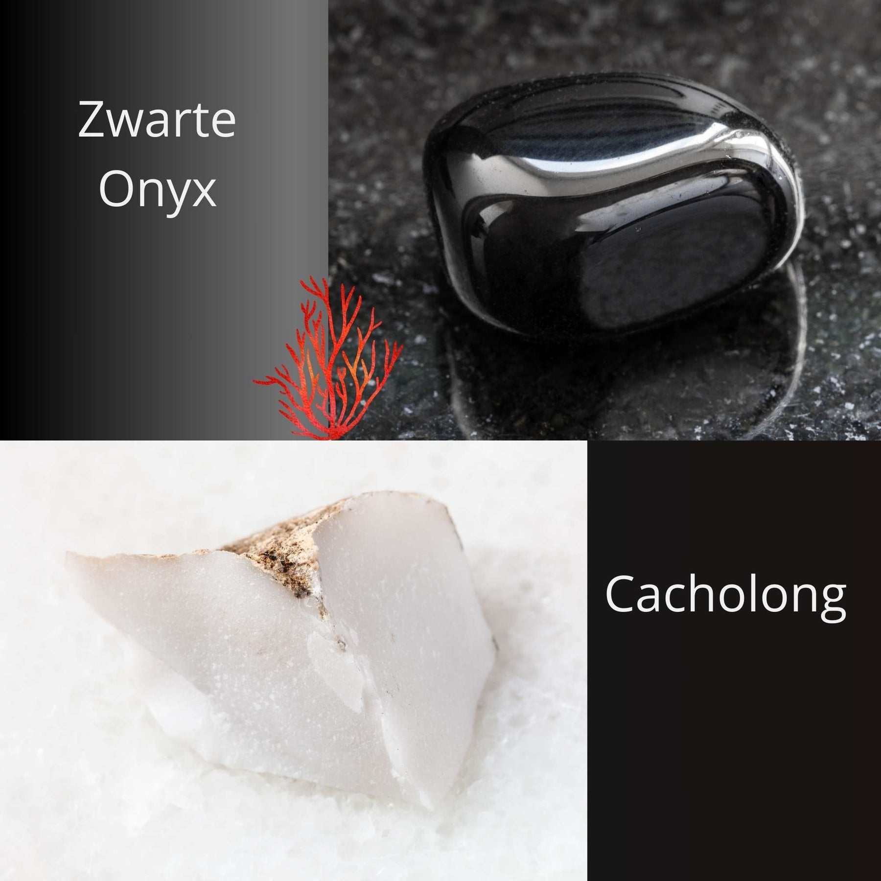 Cacholong maakt vrolijk, levenslustig, optimistisch, creatief en origineel. Zwarte onyx is een kracht steen. De steen versterkt zelfvertrouwen en moed en zorgt voor stabiliteit.