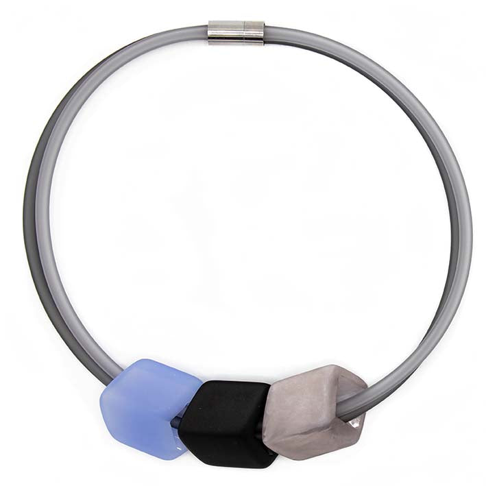 Handgemaakte sieraden van rubber en resin met verwisselbare Cubes.